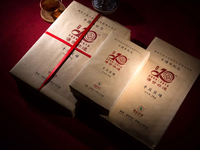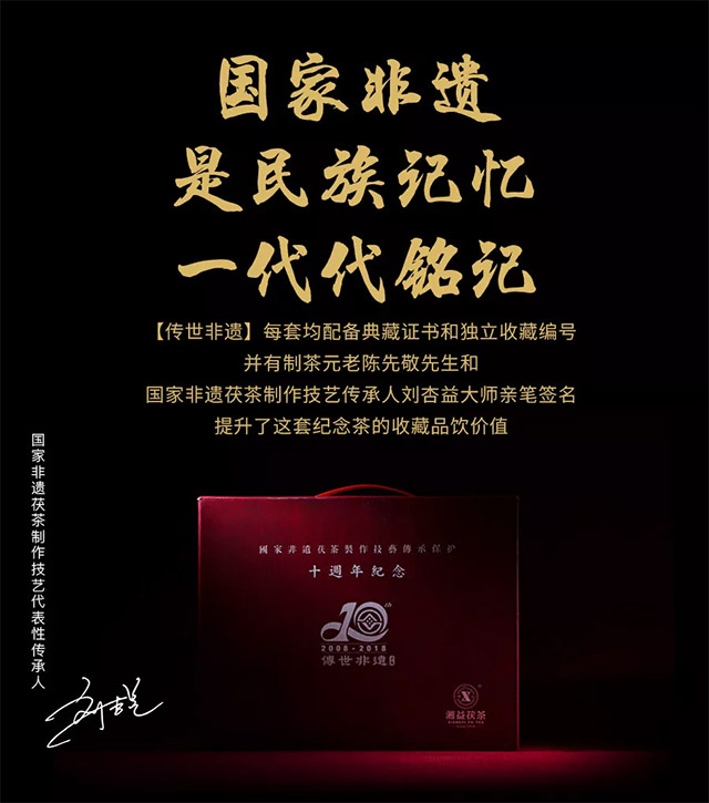 為隆重紀(jì)念茯磚茶制作技藝列入國家非物質(zhì)文化遺產(chǎn)保護(hù)名錄十周年,作為此制作技藝唯一傳承保護(hù)單位,益陽茶廠有限公司現(xiàn)特別推出【傳世非遺】紀(jì)念茶組合限量收藏禮盒套裝。