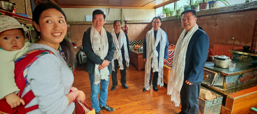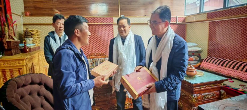 考察團(tuán)一行隨即前往山南市隆子縣調(diào)研,與隆子縣委書(shū)記李寧、縣委常委、統(tǒng)戰(zhàn)部部長(zhǎng)嘎瑪?shù)┰龅阮I(lǐng)導(dǎo)進(jìn)行了會(huì)談。趙穎君一行在縣委常委、統(tǒng)戰(zhàn)部部長(zhǎng)嘎瑪?shù)┰?、副部長(zhǎng)索朗巴珠的陪同下,翻越了三座海拔超5000米山峰,深入隆子縣斗玉珞巴民族鄉(xiāng)、玉麥鄉(xiāng)、扎日鎮(zhèn)等鄉(xiāng)鎮(zhèn)及村,不僅學(xué)習(xí)了蔵區(qū)同胞的愛(ài)國(guó)主義思想、情懷與精神,而且考察了茶葉加工廠、了解藏區(qū)本地小眾茶的生產(chǎn)、區(qū)內(nèi)區(qū)外茶消費(fèi)情況等,與此同時(shí),還走進(jìn)藏民同胞家中,代表益陽(yáng)市委統(tǒng)戰(zhàn)部贈(zèng)送“湘益”茯茶、表達(dá)了益陽(yáng)人民的熱情厚愛(ài)與對(duì)藏區(qū)人民的美好祝福。
