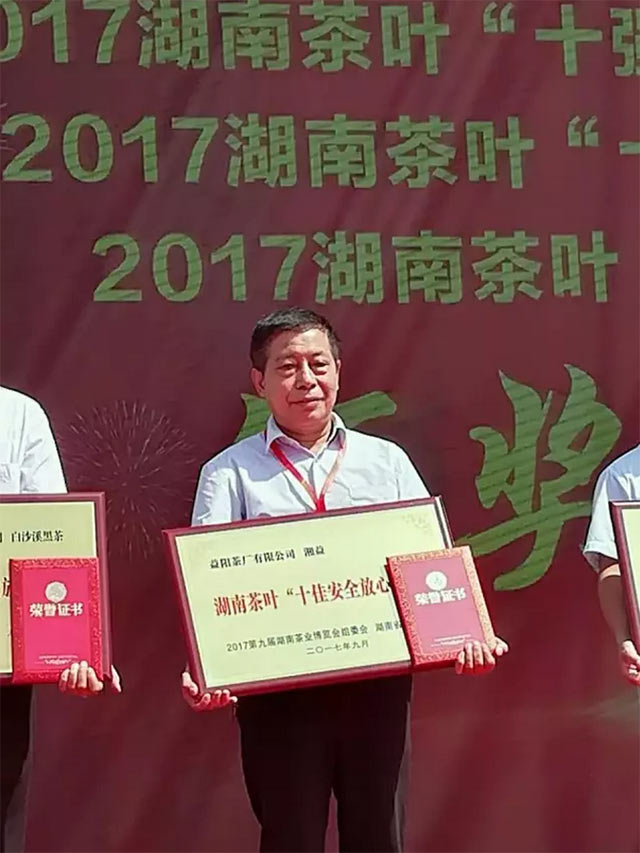 開幕式上,湖南省人民政府政協(xié)副主席戴道晉宣布第九屆湖南“茶博會”開幕。省領(lǐng)導(dǎo)為榮獲“2017湖南茶葉‘十佳安全放心品牌’‘十強生態(tài)產(chǎn)茶縣’‘十佳茶旅景區(qū)’”單位授牌頒獎。湘益茯茶榮獲湖南茶葉“十佳安全放心品牌”榮譽稱號,公司副總經(jīng)理、國家非遺茯磚茶技藝代表性傳承人劉杏益先生上臺領(lǐng)獎。